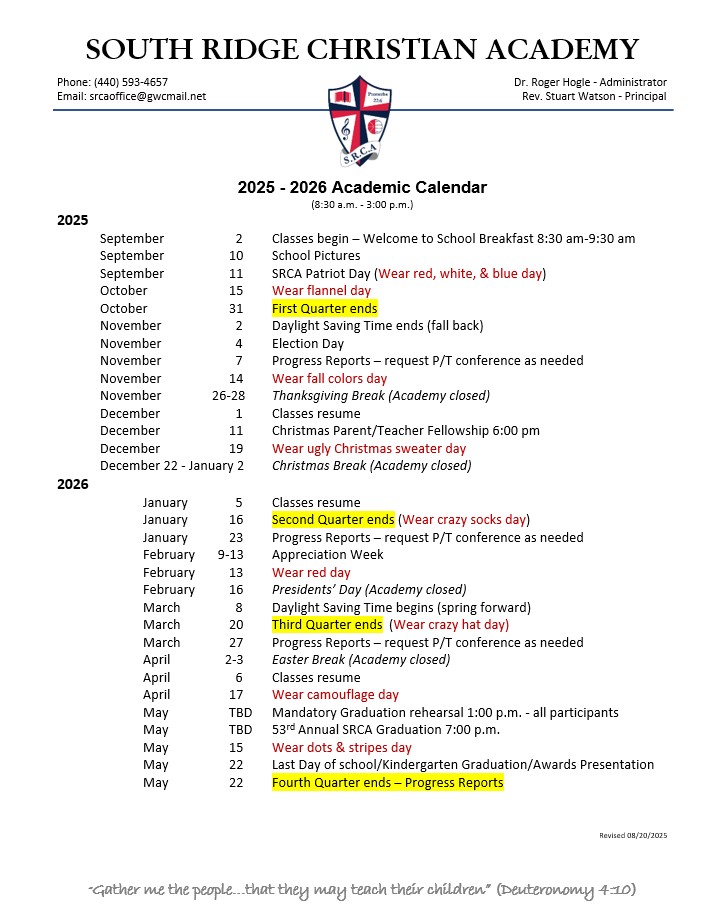 South Ridge Christian Academy is a church-owned, non-public, non-chartered school. As such, we do not receive any funding from the government. But we can accept scholarships. Please call the school office if you would like to donate towards a scholarship.